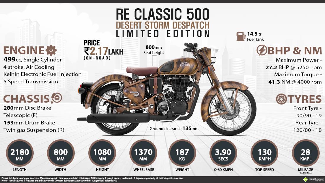Specifications Power Performance Fuel Type Petrol Petrol Max Power -- 272 bhp 5250 rpm Max Torque -- 413 Nm 4000. Royal Enfield Classic 500 Desert Storm - 500 cc engine motorcycle comes to you with sand paint scheme reminiscent of the war era. Royal Enfield Bullet 500 Classic Desert Storm.